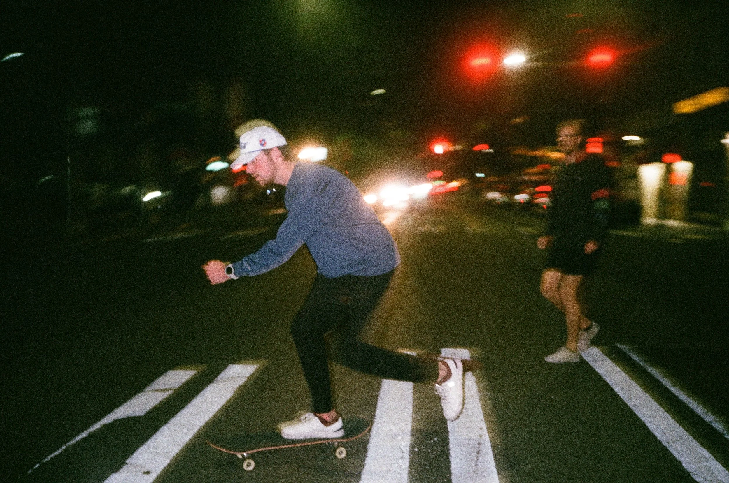 Kevin Fagan (left) and Martin Geiger skate Wallingford after pickleball, February 2023 (Olympus AF-1, Fujifilm 200)